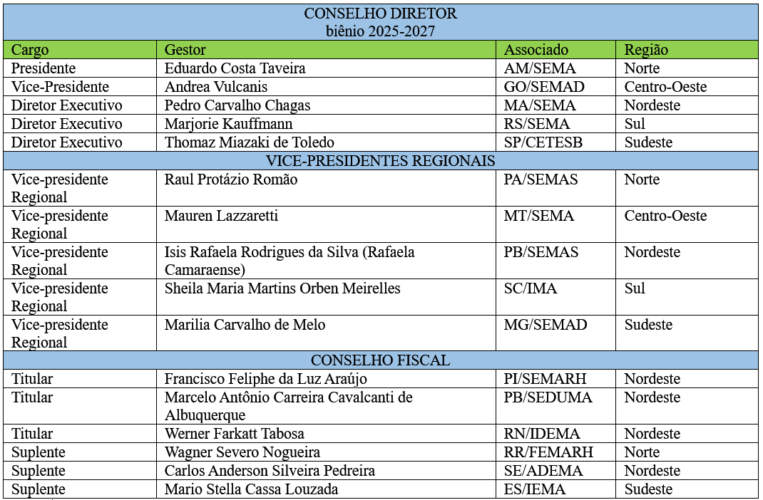 Com renovado entusiasmo, a Abema dá boas-vindas à nova diretoria para o biênio 2025–2027, sob a presidência do secretário Eduardo Costa Taveira, titular da Secretaria de Estado de Meio Ambiente do Amazonas. Temos plena confiança de que essa nova gestão dará continuidade ao trabalho de fortalecimento institucional da Abema e à defesa de uma política ambiental pública baseada em diálogo, técnica e cooperação federativa.